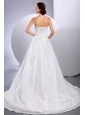 Three words come to mind to describe this dress: simple, elegant and fabulous. It features a strapless bodice with lovely sweetheart neckline and exquisite appliques. The white wedding dress is an example of high end couture fashion. The ruches on the waist area add the interest and charm. The simple lace up and a brush train complete the stunning wedding dress.