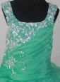 This gown makes every girls dream come true. This green princess dress is gorgeous with scoop neckline and beaded bodice. Full skirt has lots of layers and floral appliques accent on the front skirt specialize the style.The corset style bodice is finished with a lace up tie back.