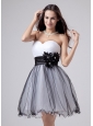 A sweetheart prom dress with a ruched bodice. A wide waistband with hand made flowers on one side. A white bodice with a black skirt is such an excellent matching on this dress. The skirt gives you a feeling of floating. Stepped on the floor, it will look as if you are floating in the air. The dress is simple, yet pretty with the contrasting effect.