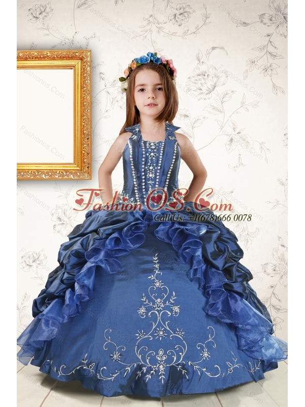 Home >  Special Occasion Dresses >  New Style Little Girl Pageant Dresses > 2015 Affordable Appliques and Pick Ups Little Girl Dress in Navy Blue