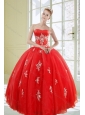2015 Exquisite Strapless Red Quince Dresses With Appliques