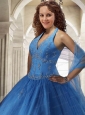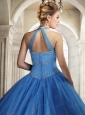 2015 Modest Halter Top Tulle Appliques Quinceanera Dress in Blue