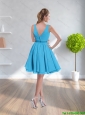 2015 New Arrivals V Neck Baby Blue Prom Dress with Ruching and Belt