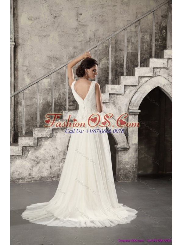 2015 New Ruching and Beading White Wedding Dresses with Brush Train