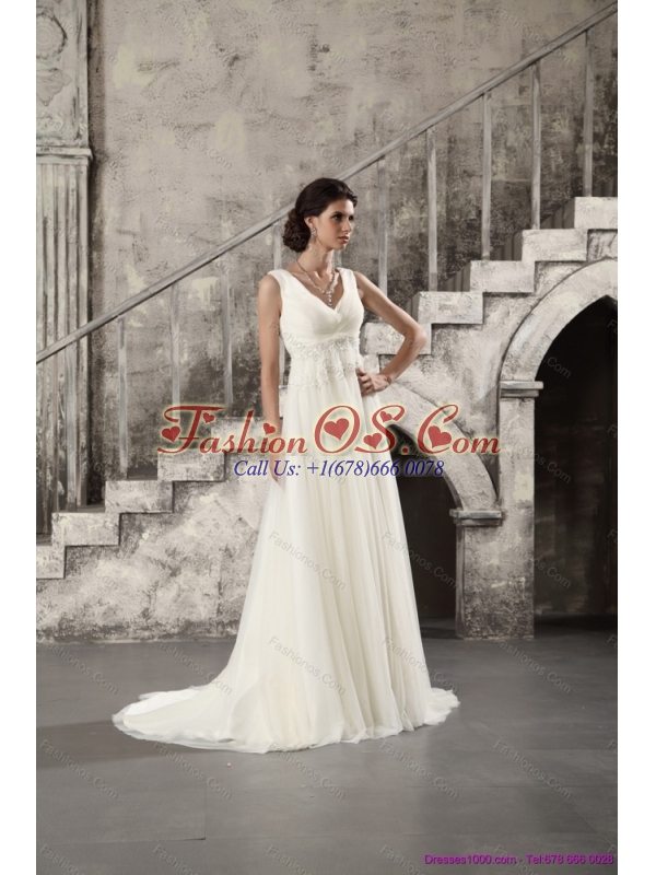 Home >  Wedding Dresses >  Fashionable Wedding Dresses > 2015 New Ruching and Beading White Wedding Dresses with Brush Train
