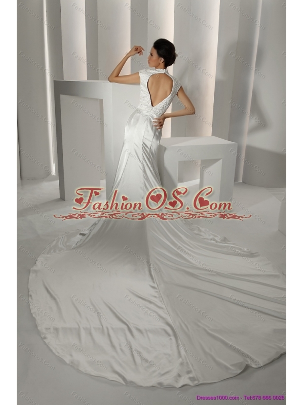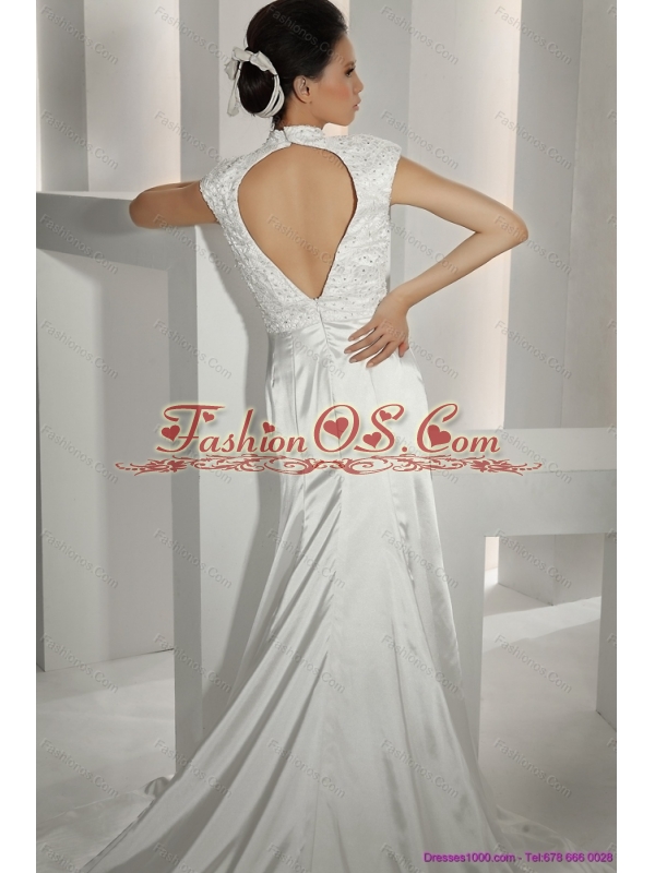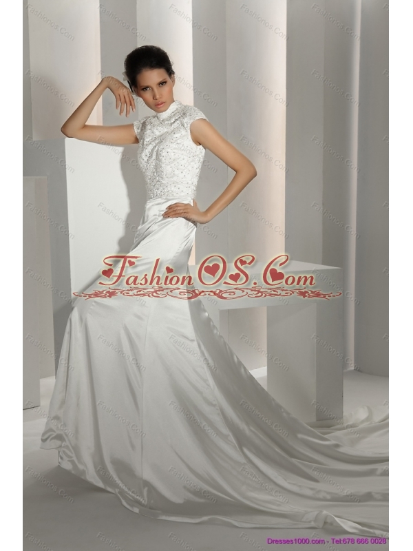 2015 New White High Neck Wedding Dresses with Cathedral Train and Beading