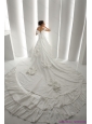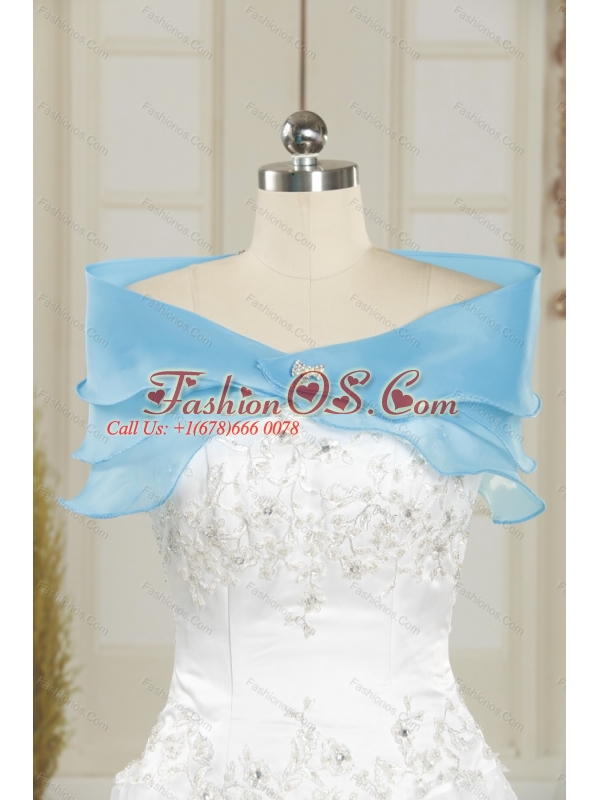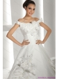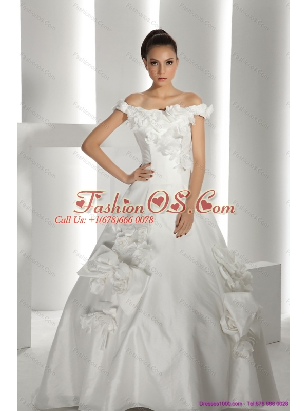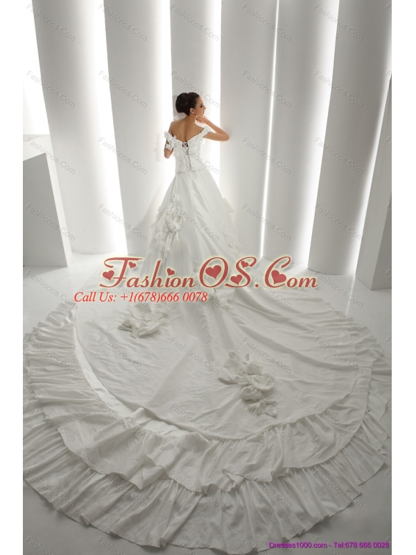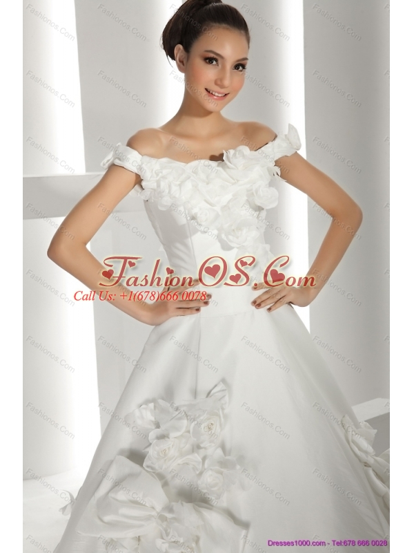 2015 New White Off Shoulder Bridal Dresses with Cathedral Train and Hand Made Flowers
