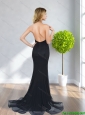 2015 Romantic Halter Top Backless Beading Black Elegant Bridesmaid Dresses with Brush Train