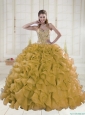 2015 Spring Sweetheart Brush Train Beading Gold Quinceanera Dress