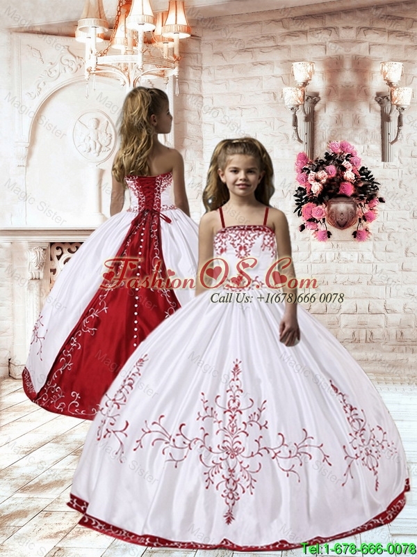2016 Fall Luxurious Spaghetti Straps White Satin Little Girl Pageant Dress with Embroidery