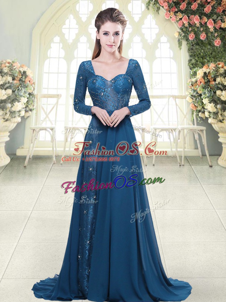 Admirable Blue Long Sleeves Beading and Lace Backless