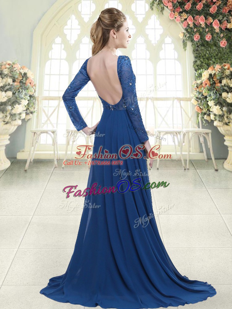 Home >  Prom Dresses >  Customized Prom Dresses > Admirable Blue Long Sleeves Beading and Lace Backless