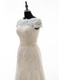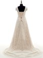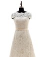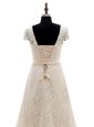 Admirable Lace Scoop Short Sleeves Brush Train Lace Up Lace and Belt Wedding Dresses in Champagne
