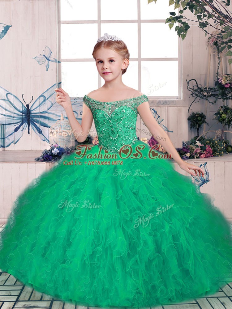 Home >  Special Occasion Dresses >  Pretty Little Girl Pageant Dresses > Admirable Off The Shoulder Sleeveless Little Girls Pageant Dress Wholesale Floor Length Beading Green Tulle