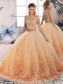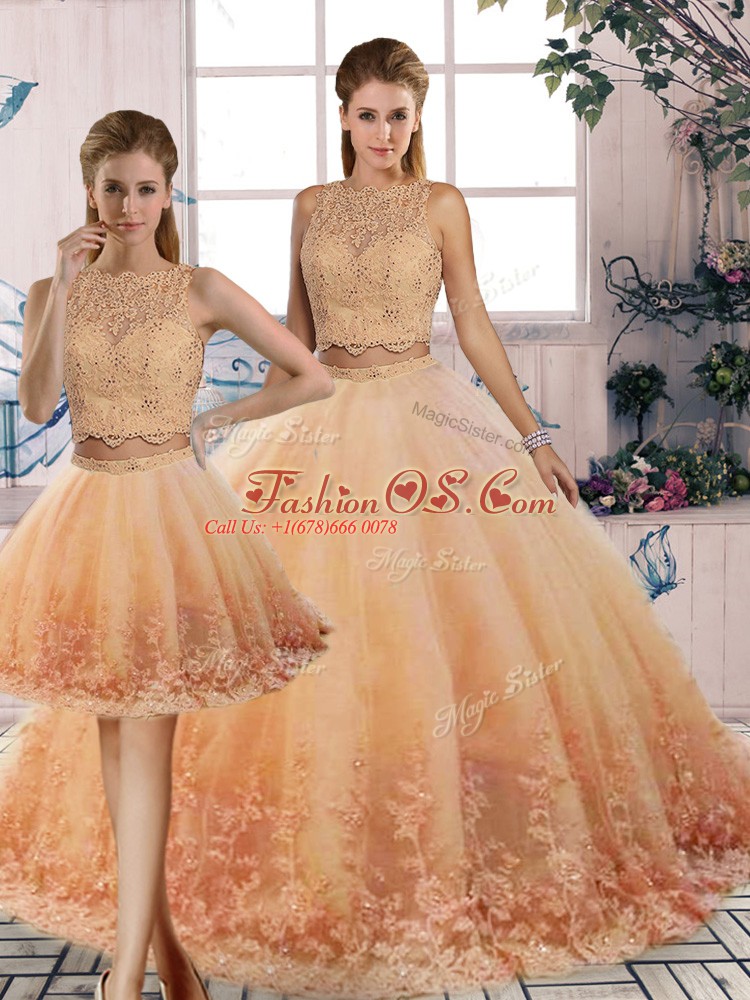 Admirable Peach Scalloped Neckline Lace Ball Gown Prom Dress Sleeveless Backless