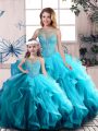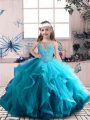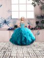Adorable Aqua Blue Ball Gowns Tulle Scoop Sleeveless Beading and Ruffles Floor Length Lace Up 15 Quinceanera Dress