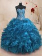 Home >  Quinceanera Dresses >  Popular Quinceanera Dresses > Adorable Blue Organza Lace Up Quinceanera Gown Sleeveless With Train Sweep Train Beading and Ruffles