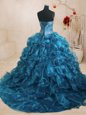 Adorable Blue Organza Lace Up Quinceanera Gown Sleeveless With Train Sweep Train Beading and Ruffles