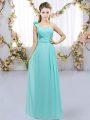 Adorable Empire Dama Dress for Quinceanera Aqua Blue One Shoulder Chiffon Sleeveless Floor Length Lace Up