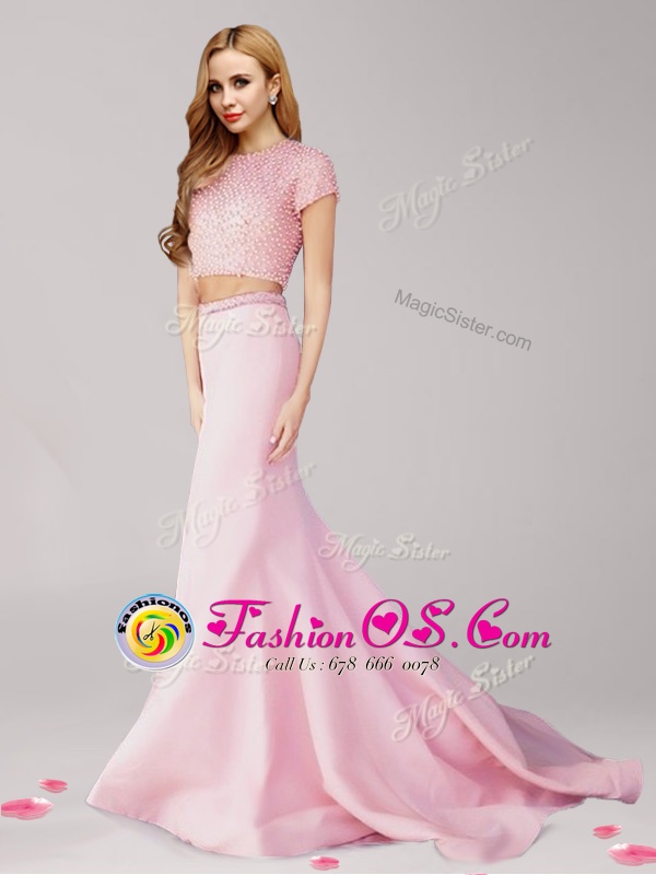 Home >  Prom Dresses >  Perfect Prom Dresses > Adorable Scoop Pink Column/Sheath Beading Prom Party Dress Zipper Satin Short Sleeves With Train