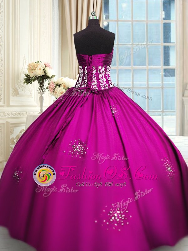 Adorable Sleeveless Floor Length Beading and Appliques and Ruching Lace Up Quinceanera Gown with Fuchsia