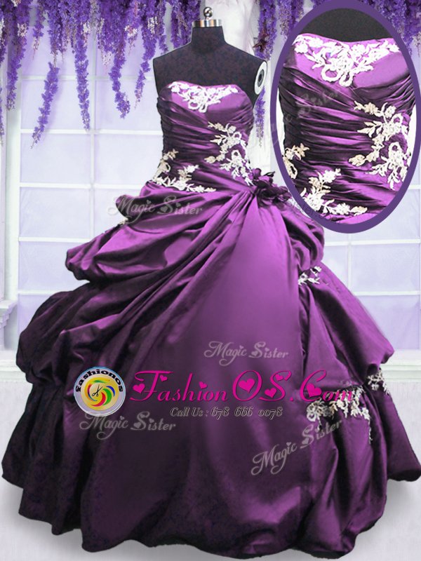 Home >  Quinceanera Dresses >  Fast Delivery Quinceanera Dresses > Adorable Taffeta Strapless Sleeveless Lace Up Appliques and Pick Ups Sweet 16 Dress in Purple