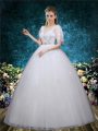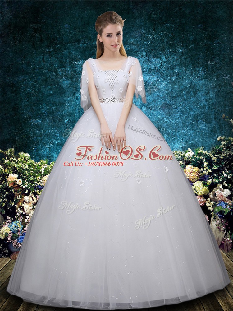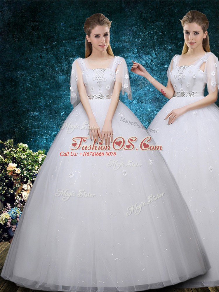 Adorable White Short Sleeves Floor Length Beading and Appliques Lace Up Wedding Dresses