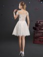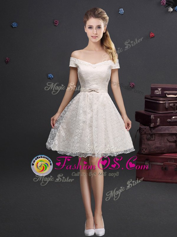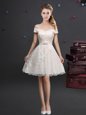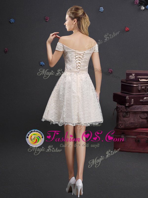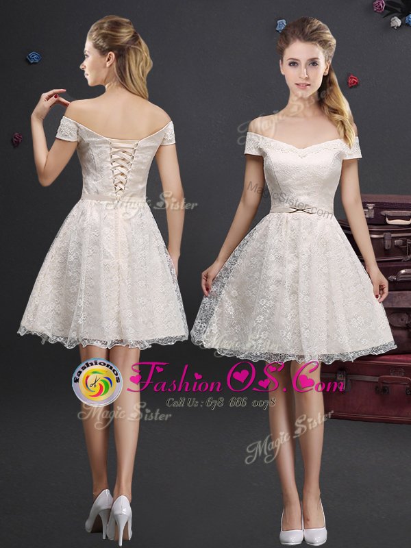 Affordable A-line Wedding Party Dress Champagne Off The Shoulder Lace Sleeveless Knee Length Lace Up