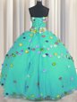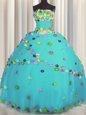 Home >  Quinceanera Dresses >  Puffy Quinceanera Dresses > Affordable Aqua Blue Tulle Lace Up Quince Ball Gowns Sleeveless Floor Length Hand Made Flower