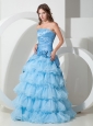 Strapless dresses are one of the sexier styles on the market today. They show just enough skin to be classy without being too revealing. This one features gorgeous beading on the top bustline accent with ruching waist to fatter the bust. The perfectly fitted bodice continues to the hem with several three-dimensional flowers to decorate. The amazing A-line skirt is reminiscent of the old fashioned hoop skirts and is made from several layers of organza ruffles that add another dimension of beauty to an already lovely gown. The dress sways beautifully across the floor when you move, as if you're floating on air. A lace up corset style closure in the back secures the dress in place.