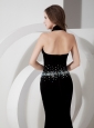 Affordable Black Mermaid Halter Evening Dress Silk Like Satin Beading Brush Train