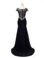 Affordable Black Mermaid Scoop Cap Sleeves Elastic Woven Satin Brush Train Zipper Beading and Ruching Formal Dresses