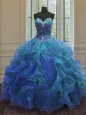 Home >  Quinceanera Dresses >  15 Quinceanera Dresses > Affordable Blue Organza and Sequined Lace Up Quince Ball Gowns Sleeveless Floor Length Beading and Ruffles