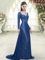 Affordable Blue Zipper Sweetheart Beading and Lace Prom Dresses Chiffon Long Sleeves Sweep Train