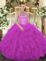 Affordable Fuchsia Organza Lace Up Halter Top Sleeveless Floor Length Quinceanera Gown Beading and Embroidery and Ruffles