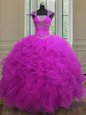 Home >  Quinceanera Dresses >  Sweet 16 Dresses > Affordable Fuchsia Organza Lace Up Straps Sleeveless Floor Length 15 Quinceanera Dress Beading and Ruffles and Sequins