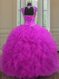 Affordable Fuchsia Organza Lace Up Straps Sleeveless Floor Length 15 Quinceanera Dress Beading and Ruffles and Sequins