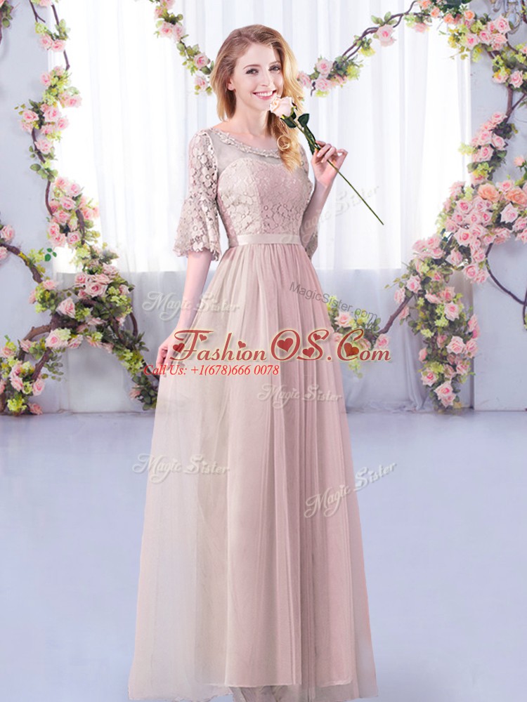 Home >  Special Occasion Dresses >  Discount Dama Dresses > Affordable Half Sleeves Tulle Floor Length Side Zipper Dama Dress for Quinceanera in Pink with Lace and Belt