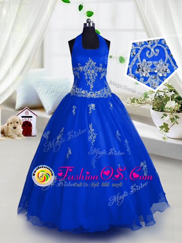 Affordable Halter Top Blue Lace Up Little Girl Pageant Gowns Appliques Sleeveless Floor Length
