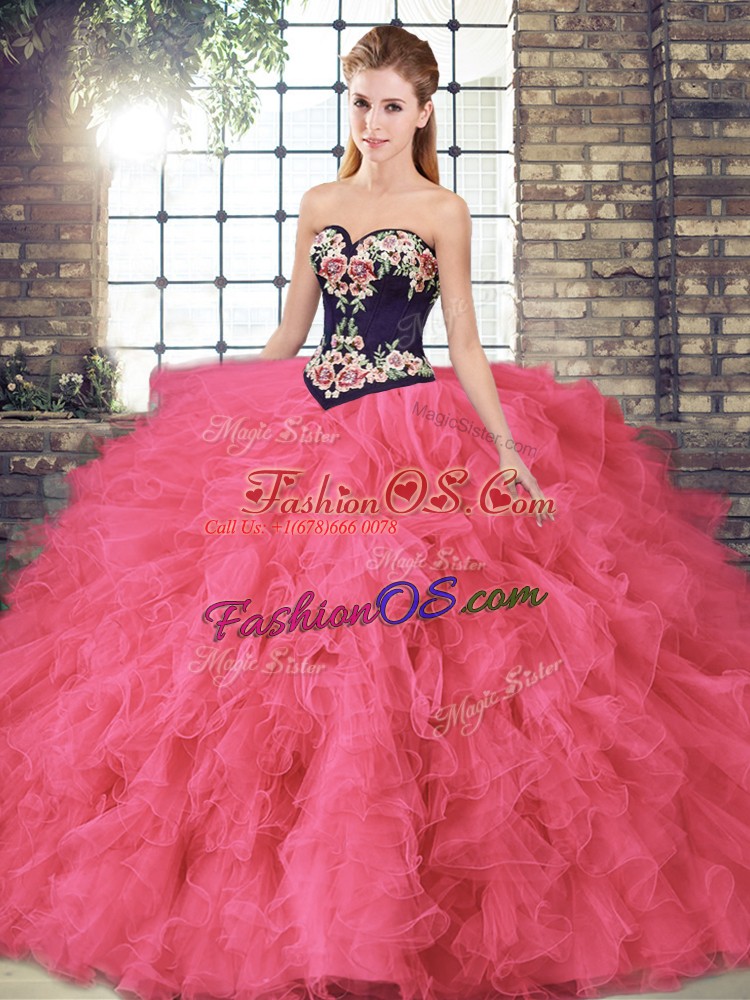 Affordable Hot Pink Sleeveless Tulle Lace Up Ball Gown Prom Dress for Sweet 16 and Quinceanera