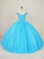 Home >  Quinceanera Dresses >  Clearance Quinceanera Dresses > Affordable Off The Shoulder Sleeveless Ball Gown Prom Dress Floor Length Beading Blue Tulle