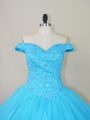 Affordable Off The Shoulder Sleeveless Ball Gown Prom Dress Floor Length Beading Blue Tulle