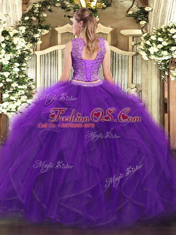 Home >  Quinceanera Dresses >  Fast Delivery Quinceanera Dresses > Affordable Purple Two Pieces Tulle Scoop Sleeveless Beading and Ruffles Floor Length Lace Up Vestidos de Quinceanera
