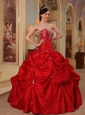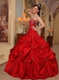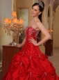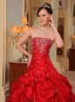 If you're longing for the romantic and heavily detailed gowns of Quinceanera, this one may be just what you're looking for.It has a strapless bodice with a beaded neckline and gorgeous beadwork throughout.This taffeta gown is embellished with beaded embroidery and scattered beadings that add interest and detail. The full pick-up skirt is embellished with beaded appliques that complement the beadwork in the bodice perfectly. You'll be the belle of the ball in this glittering red ball gown.