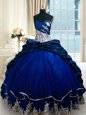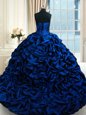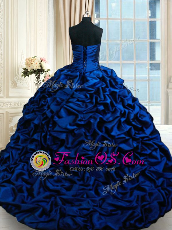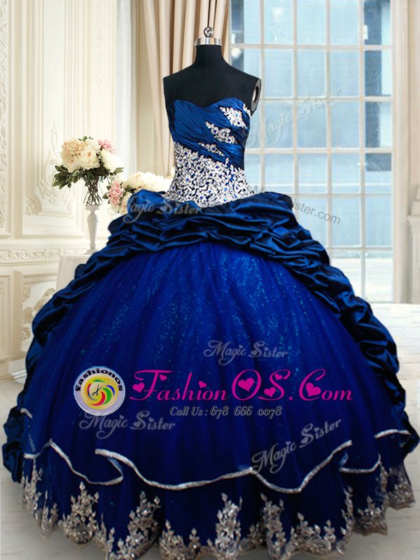 Affordable Sleeveless Appliques and Pick Ups Lace Up Quinceanera Gown with Royal Blue Court Train