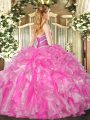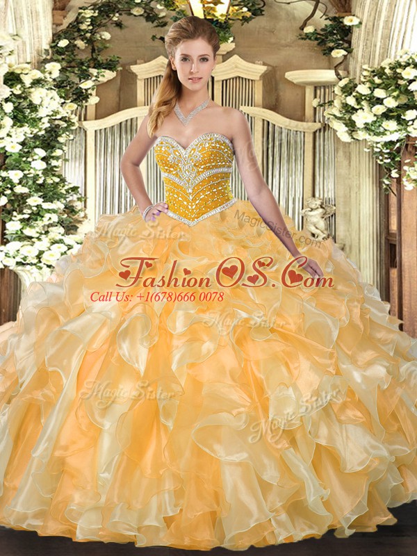 Affordable Sleeveless Organza Floor Length Lace Up 15th Birthday Dress in Orange with Beading and Ruffles