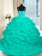 Home >  Quinceanera Dresses >  Popular Quinceanera Dresses > Affordable Spaghetti Straps Sleeveless Organza Quinceanera Dresses Beading and Ruffles Brush Train Lace Up