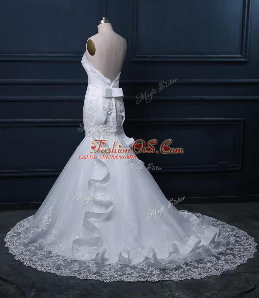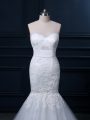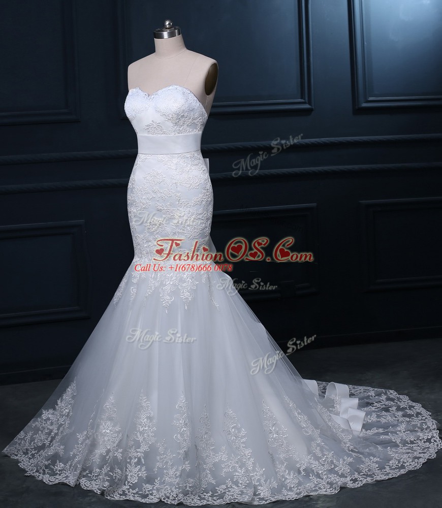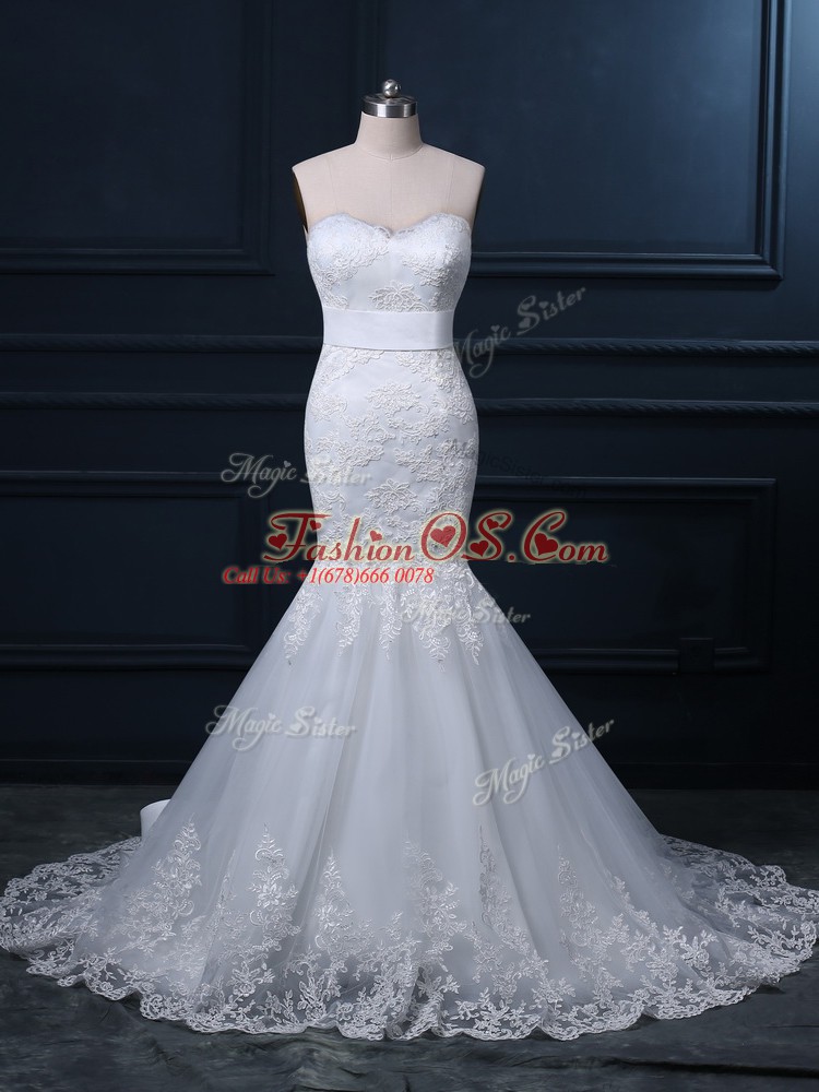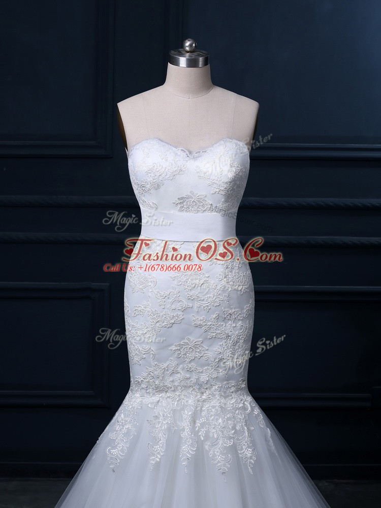 Affordable White Mermaid Tulle Sweetheart Sleeveless Lace Zipper Bridal Gown Brush Train