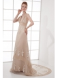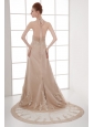 A-line Champagne Halter Top Neck Appliques Backless Court Train Prom Dress
