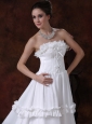 This perfect strapless chiffon wedding dress is featured with the foral embellishment on the bodice in the bust area. The delicate handed flowers at the hips adds more elegance and beauty to the dress. The Court train looks flowy and dynamic in any angle as rains of flowers fully scattered the bottom part in a circle. It is an ideal dress for your wedding!
